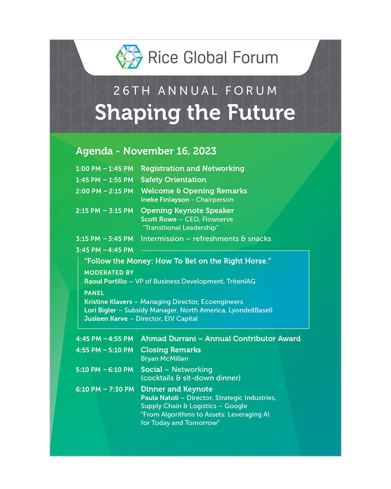 We also conducted a social media audit with recommendations to apply their new branding as well as streamline and strengthen their social identity. In our continued relationship with Rice Global Forum we supported their yearly marketing efforts and events with social media maintenance, digital graphics, print collateral, promotional items, conference displays and more.